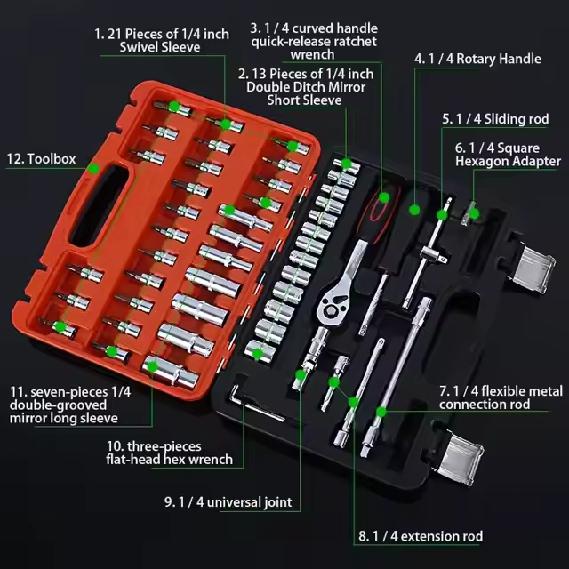 ১/৪-ইঞ্চি ড্রাইভ সকেট র্যাচেট রেঞ্চ সেটটি আপনার গাড়ির রক্ষণাবেক্ষণের সকল চাহিদা পূরণে সক্ষম। এটি পেশাদারভাবে ডিজাইন করা হয়েছে, যা অর্থ, সময় ও পরিশ্রম সাশ্রয় করতে সহায়ক।